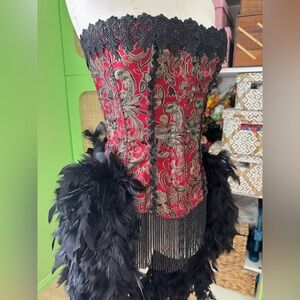 Stunning red, black and gold corset featuring lace trim a luxurious feather bustle and beaded fringe.