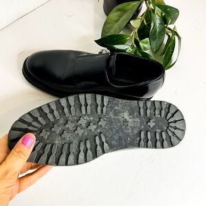 Made in Portugal, these shoes feature smooth black leather, a rounded almond toe, and sturdy lug soles that add a subtle utilitarian edge. The zip-front accent gives them a clean, contemporary look while keeping the silhouette sharp and easy to style.