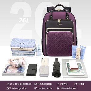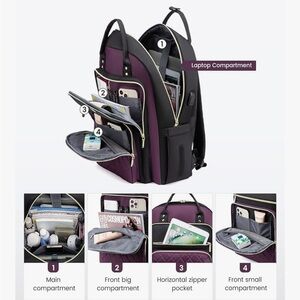 - Stylish purple and black backpack featuring a USB charging port. Perfect for travel or daily use.