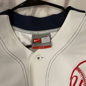 Classic Nike baseball jersey in white. Features navy accents and embroidered logo. Ideal for sports fans.