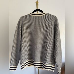 Navy and cream cardigan with gold buttons and cream contrasting stripe on hem, pocket, and cuff. Four gold buttons with two functional pockets.