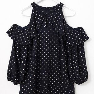 New York and Company. Stylish gold polka dot cold shoulder top with elegant ruffle details. Perfect for a chic and modern look. 100% polyester.