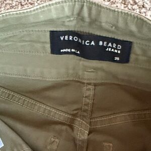 Chic olive jeans with ankle tabs. Stylish and versatile.