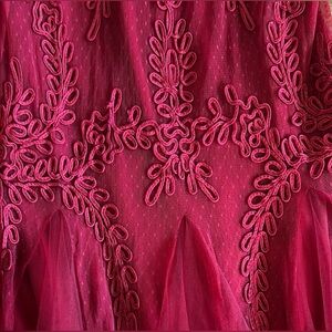 A knockout red mermaid gown engineered for maximal “stop scrolling” energy. Cachet delivers a sculpted V-neck silhouette, full embroidered lace appliqué, dotted mesh texture, and a dramatic tulle mermaid flare.