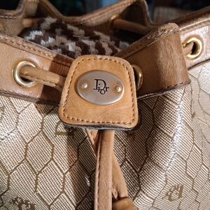 Authentic Christian Dior shoulder bag crafted in signature honeycomb monogram canvas with tan leather trim, paired with a matching detachable pouch. Features gold-tone hardware, a drawstring-style top, and classic Dior detailing throughout. Measurements: W 10.0" x H 10.5" x D 5.0". This little set of shoulder bag and pouch are really really cute. The pouch can be removed and carried by itself. Please go check out the pictures to see for yourself. If you have any questions please let me know thanks