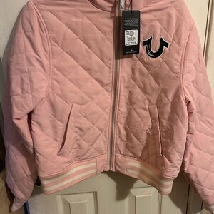 The Horseshoe Quilted Bomber Jacket is the perfect layering piece for any season. This sleek, quilted jacket features a funnel neckline, zip-front closure, varsity-striped trim, and an embroidered horseshoe patch on the front.