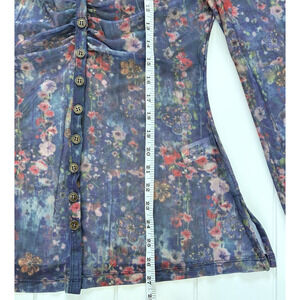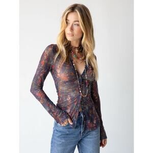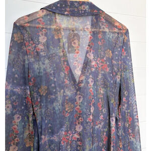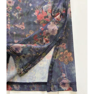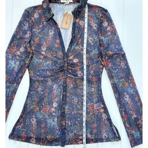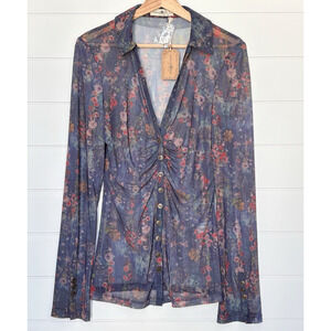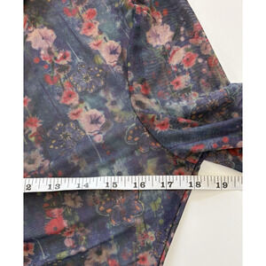 NEW Natural Life Carina Mesh Top Watercolor Indigo Floral Sheer V-Neck Boho L