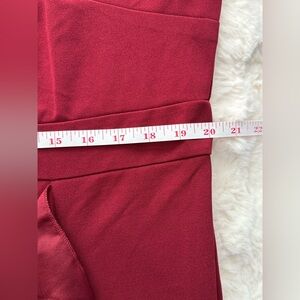 STUNNING asymmetrical dress with elegant flutter sleeve, front leg slit with ruffle detail, and incredibly slimming fit. The bottom flows beautifully. Pictures do not do this dress justice at all.