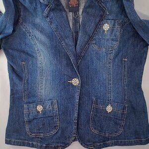 D. Jeans Blue Fitted One Button Blazer Jacket GUC with Rhinestone Bling Buttons