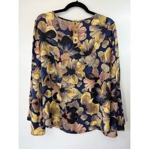 Cable & Gauge Deep Colored Floral Blouse With Unique Ruffled Sleeves Size XL