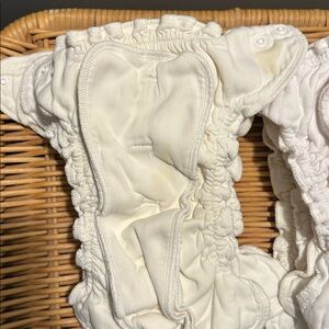 Good used condition, laundered using Esembly powder and Calgon (very hard water!) I have done a bleach wash for them to be ready for another baby to use! One inner is stained as pictured.
