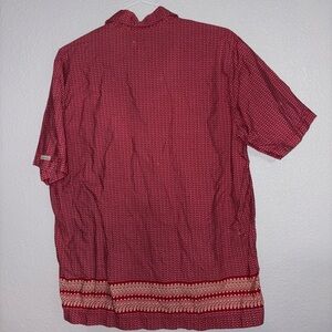 Casual button-down shirt with a red pattern. Features short sleeves and a stylish design. Ideal for everyday wear.