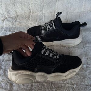 Chic Moschino sneakers with black upper and white accents. Fun bear imprint on sole.