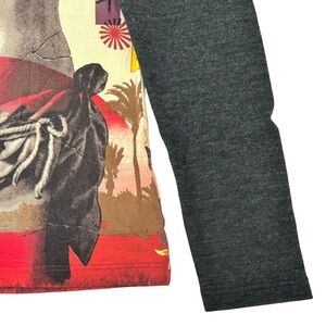 Super rare top from the iconic Gaultier Jean's label by Jean Paul Gaultier featuring a broken marble Venus bust surrounded by palm trees, Japanese calligraphy, the Gaultier Jean's logo spelled out in Japanese style letters, cherry blossoms, butterflies and rising suns.