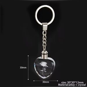 Crystal heart keychain featuring internal etched rose pattern illuminated by a soft red / pink LED light. Dainty and feminine accent piece that can be used for a keychain as designed, or put it on a chain and wear it around your neck. Have fun with this cute piece!