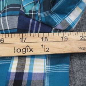 Pattern/Color: Blue, teal, gray, and white patchwork madras plaid