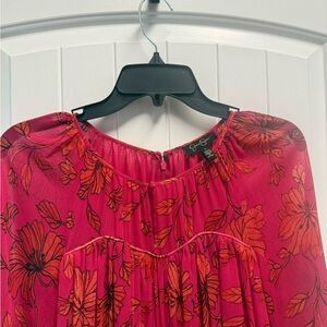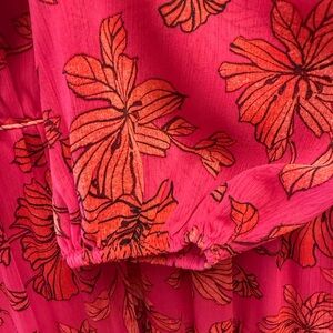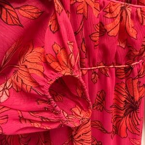 Stunning Jessica Simpson Sasha maxi dress featuring a vibrant blossom floral print in rich pink and coral tones. Designed with long sheer sleeves, a softly gathered neckline, and a flattering empire-style waist that flows into a breezy, feminine maxi skirt. Lightweight and elegant, making it perfect for spring events, weddings, date nights, vacations, or everyday boho style.