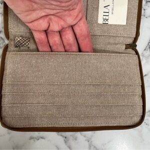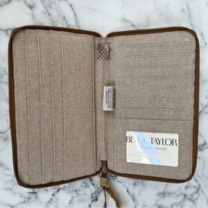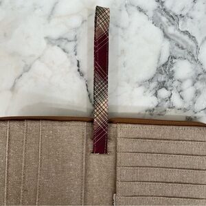 Bella Taylor Quilted Wallet Plaid Patchwork Zip Wristlet Red Tan Cotton. The inside has a little handle that could be pulled up and used as a wristlet.