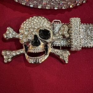 Sparkling rhinestone belt with a skull buckle. Perfect for adding edge to any outfit.