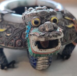 For your consideration, old Chinese Export sterling silver enameled Dragon Ashtray with a genuine lavender jade rim measuring 6 ¾ inches and weighing 332 grams.This stunning piece showcases amazing craftsmanship and details in vibrant colors, it is signed and dates back to the early 20th century. Originating from China, this antique ashtray would make a lovely addition to any Asian antiques collection.