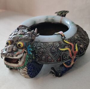 Chinese Export Dragon Ashtray Sterling Silver Enamel Jade Rim 332gr