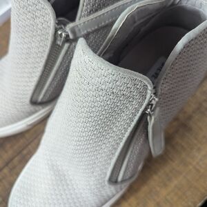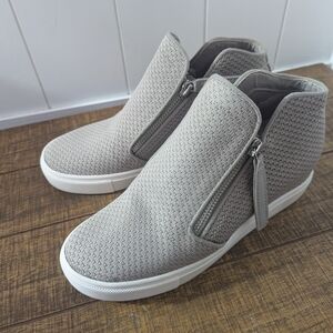 Stylish high-top sneakers. Textured gray material. Side zipper detail. Comfortable white sole.