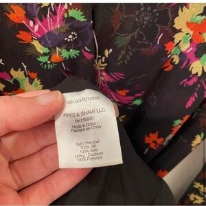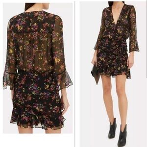 Chic floral mini dress. Sheer long sleeves. Wrap style with ruffle details.