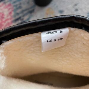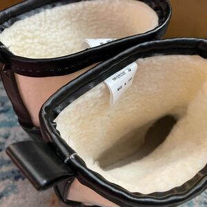 Black rubber rain boots with fleece tops covered in clear plastic.