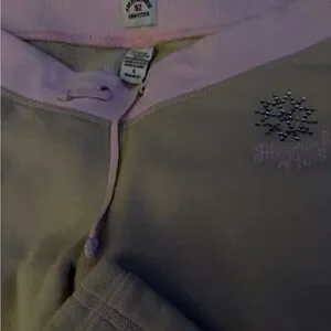 Stylish tan an pink sweatpants featuring a sparkling embellished snowflake logo.Ideal for a chic casual look. worn only one time good condition smoking pet free home.