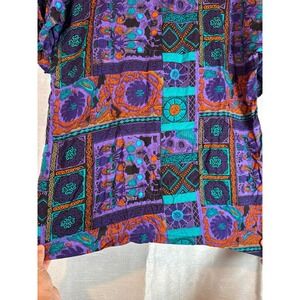 Unique vintage short sleeve t-shirt featuring a striking patchwork design in purple, orange, and teal tones. This eye-catching shirt offers a comfortable, relaxed fit, perfect for adding a bold statement to any casual outfit. The intricate pattern and vibrant colors make it a standout piece, suitable for everyday wear or adding a touch of retro flair to your wardrobe. Ideal for casual outings, concerts, or vintage-themed parties.