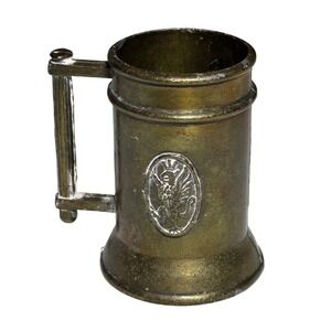 Keywords: miniature stein, brass tankard, collectible goblet, trinket holder, lion emblem, vintage decor, desk accessory, bar cart styling, unique gift, shelf decor, table accent, historical charm, ornate handle