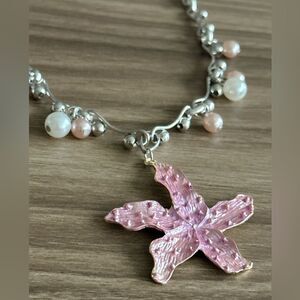Elegant necklace featuring a pink starfish pendant with pearl accents. Stainless steel, 18K gold plated