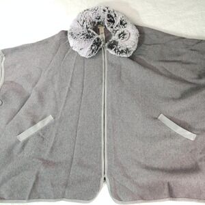 Chicos Cardigan Womens Size Medium Gray Fur Collar Cape Shawl Poncho Sweater Zip