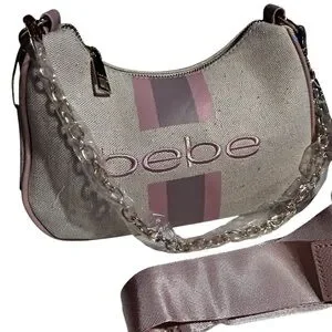 Elegant Bebe shoulder bag with a chic pink stripe. Features a stylish chain strap. Ideal for versatile wear. The crossbody strap and the chain strap are removable. The dimensions are approximately 10x5x3