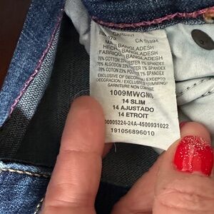 Stylish straight leg jeans by Wrangler. Comfortable fit. Timeless blue color. Size 14 slim. Inseam length 29 1/2 inches.