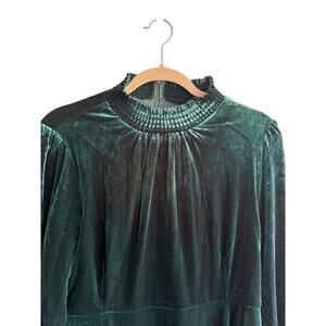 Brand new with the tags! Absolutely stunning emerald green color.. none of the pictures do this color justice! Rear zipper, long sleeve, high neck, flowy. Material has stretch. Balloon sleeves.