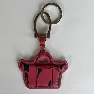 Cute Longchamp Le Pliage Cuir keyring in cherry pink leather. Shaped like the iconic Le Pliage tote with silver-tone hardware and “LONGCHAMP” logo ring.