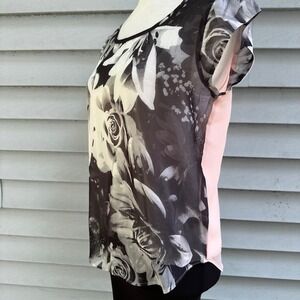 Keywords: floral blouse, sheer top, black and white blouse, cap sleeve top, womens blouse, floral print top, black blouse, white blouse, dressy blouse, elegant top, casual blouse, semi-sheer blouse, american eagle top, polyester blouse