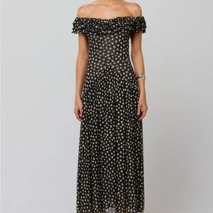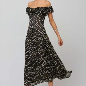 off-the-shoulder neckline and a flattering midi length, worn once on vacation - has been dry-cleaned!