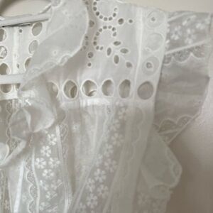 This stunning and elegant Sandro blouse showcases a flutter sleeve design with a tie front and ruffled accents, all in a crisp white hue. The cropped length and intricate lace detailing add a modern touch to its romantic, vintage-inspired style.