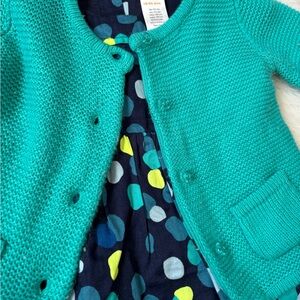 Charming teal cardigan with a playful polka dot dress. Ideal for fun outings. VGUC, sweater has some pilling. Dress in excellent condition. Pet free and smoke free home