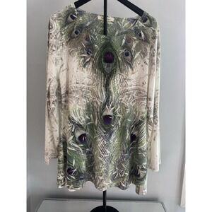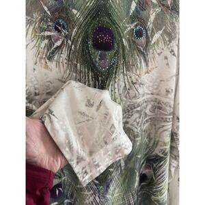 Indigo Soul Women's Sz L Peacock Feather Rhinestone Tunic Top Sheer Boho
