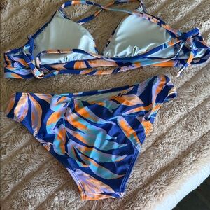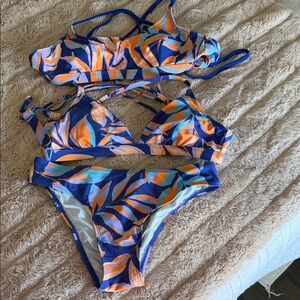 Vibrant bikini set with a leaf pattern. Features shades of blue, orange, and white. So small comes with two different tops both the tops and the bottom are size small moderate coverage on the bottom. Worn once.