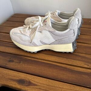Stylish New Balance sneakers in beige and white. Ideal for everyday wear. Comfortable and trendy design.