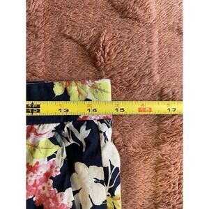Zara Women's Floral Wide-Leg Pants in black multicolor are perfect for a casual occasion. Made of cotton with a woven fabric type, these pants feature a flat front, wide-leg style, and a 32-inch inseam. The pants have a zip and button closure, accented with colorful floral patterns in navy, orange, pink, and white. The regular fit and size M make these pants a stylish and comfortable choice for the summer and spring seasons.