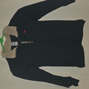 Chic tunic top with navy and green stripes. Features a stand collar and button details.
