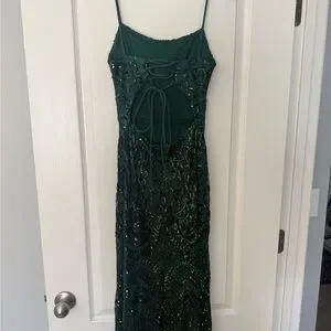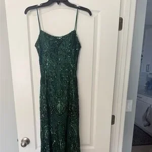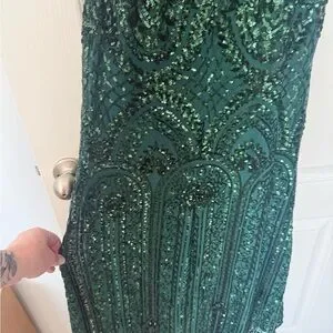Stunning emerald gown with shimmering sequins. Ideal for prom nights. Elegant and eye-catching design.
