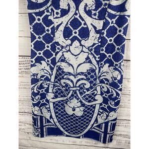 Vibrant blue and white baroque-inspired print with intricate scrolling and medallion patterns