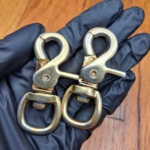 Gold plated solid metal hardware from a Y2K (2008 specifically, I think) botkier Stevie bag strap. A bit of the gold plating has worn off. These swivel clasps are similar in style and size to the old Rebecca Minkoff solid metal hardware and could be decent replacements for a RM bag strap. Last two pics show comparisons. The RM strap is NOT for sale; this listing is for the two botkier clasps only.