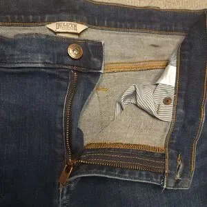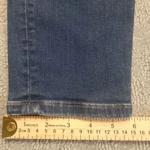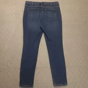 Duluth Trading womens jeans in size 14 with a 30-inch inseam. Cotton blend denim with stretch in a solid blue wash. Mid-rise fit with a zip closure, five-pocket design, and straight leg. A13 0940